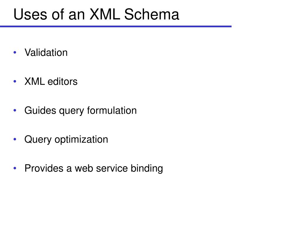 Uses of an XML Schema • Validation • XML editors • Guides query formulation • Query optimization • Provides a web service binding