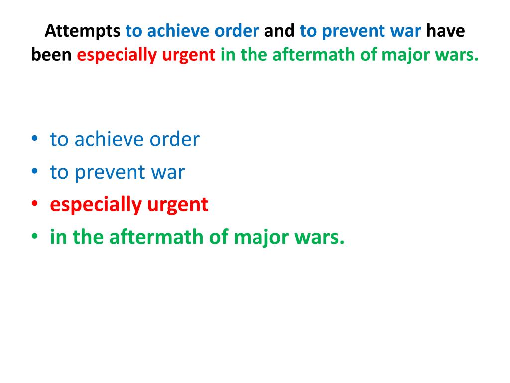 Attemptstoachieveorderandtopreventwarhavebeenespeciallyurgentin theaftermath of majorwars. • toachieveorder • topreventwar • especiallyurgent • in theaftermath of majorwars.