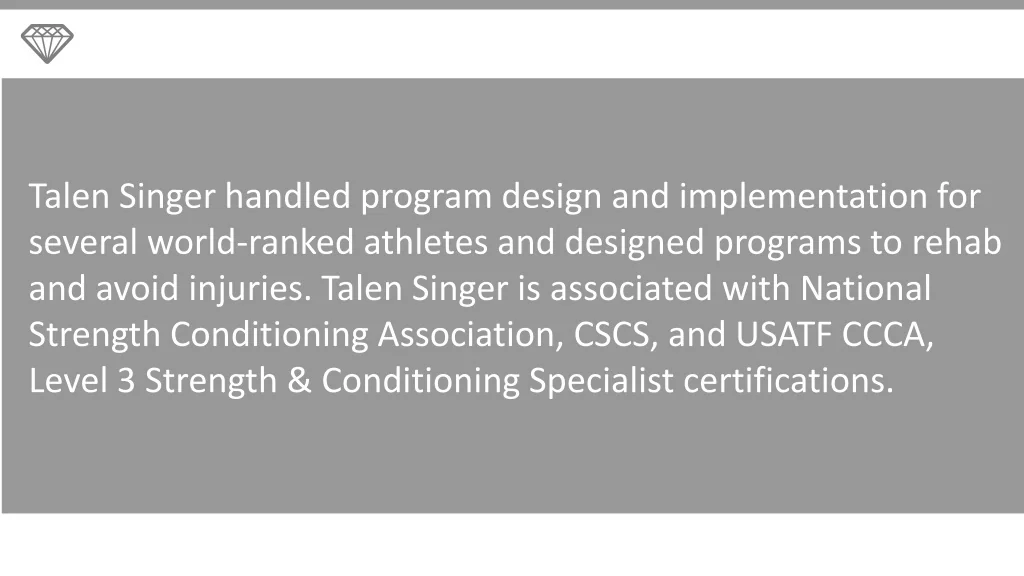 Talen Singer handled program design and implementation for several world-ranked athletes and designed programs to rehab and avoid injuries. Talen Singer is associated with National Strength Conditioning Association, CSCS, and USATF CCCA, Level 3 Strength & Conditioning Specialist certifications.