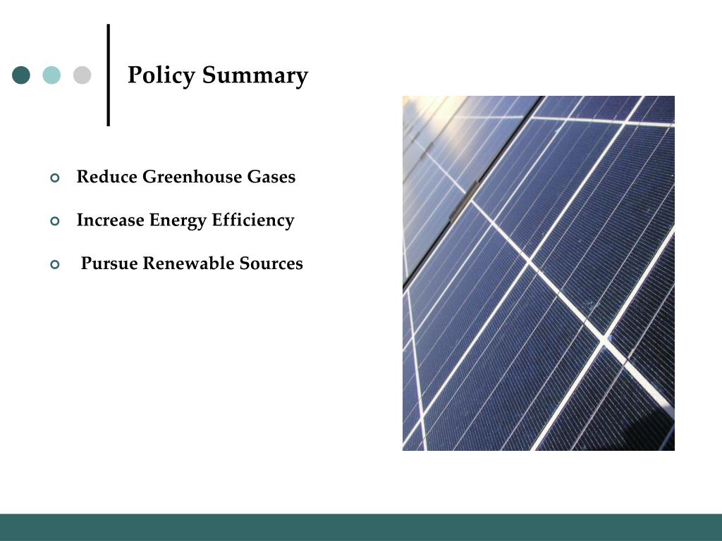 Policy Summary • Reduce Greenhouse Gases • Increase Energy Efficiency • Pursue Renewable Sources