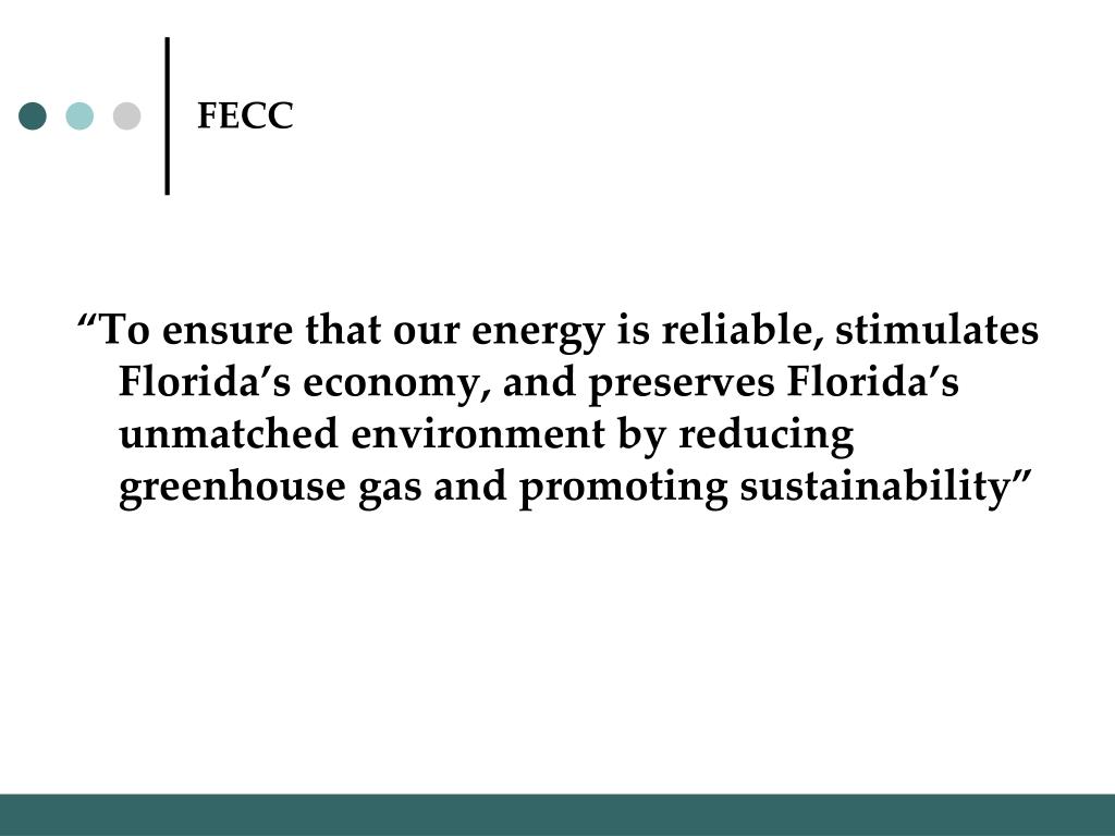 FECC “To ensure that our energy is reliable, stimulates Florida’s economy, and preserves Florida’s unmatched environment by reducing greenhouse gas and promoting sustainability”