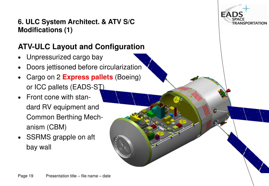 6. ULC System Architect. & ATV S/CModifications (1) ATV-ULC Layout and Configuration • Unpressurized cargo bay • Doors jettisoned before circularization • Cargo on 2 Express pallets (Boeing) or ICC pallets (EADS-ST) • Front cone with stan- dard RV equipment and Common Berthing Mech- anism (CBM) • SSRMS grapple on aft bay wall Presentation title – file name – date