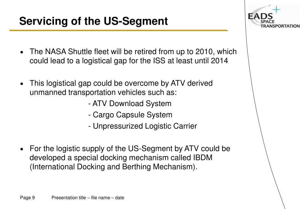Servicing of the US-Segment • The NASA Shuttle fleet will be retired from up to 2010, which could lead to a logistical gap for the ISS at least until 2014 • This logistical gap could be overcome by ATV derived unmanned transportation vehicles such as: - ATV Download System - Cargo Capsule System - Unpressurized Logistic Carrier • For the logistic supply of the US-Segment by ATV could be developed a special docking mechanism called IBDM (International Docking and Berthing Mechanism). Presentation title – file name – date