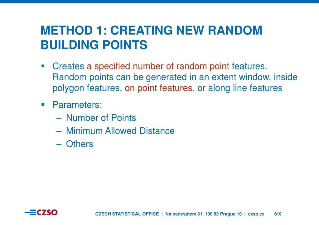 METHOD 1: CREATING NEW RANDOM BUILDING POINTS • Creates a specified number of random point features. Random points can be generated in an extent window, inside polygon features, on point features, or along line features • Parameters: • Number of Points • Minimum Allowed Distance • Others