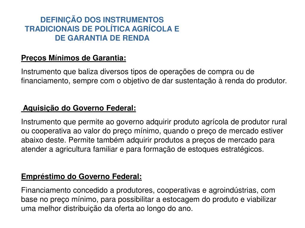 DEFINIÇÃO DOS INSTRUMENTOS TRADICIONAIS DE POLÍTICA AGRÍCOLA E DE GARANTIA DE RENDA Preços Mínimos de Garantia: Instrumento que baliza diversos tipos de operações de compra ou de financiamento, sempre com o objetivo de dar sustentação à renda do produtor. Aquisição do Governo Federal: Instrumento que permite ao governo adquirir produto agrícola de produtor rural ou cooperativa ao valor do preço mínimo, quando o preço de mercado estiver abaixo deste. Permite também adquirir produtos a preços de mercado para atender a agricultura familiar e para formação de estoques estratégicos. Empréstimo do Governo Federal: Financiamento concedido a produtores, cooperativas e agroindústrias, com base no preço mínimo, para possibilitar a estocagem do produto e viabilizar uma melhor distribuição da oferta ao longo do ano.