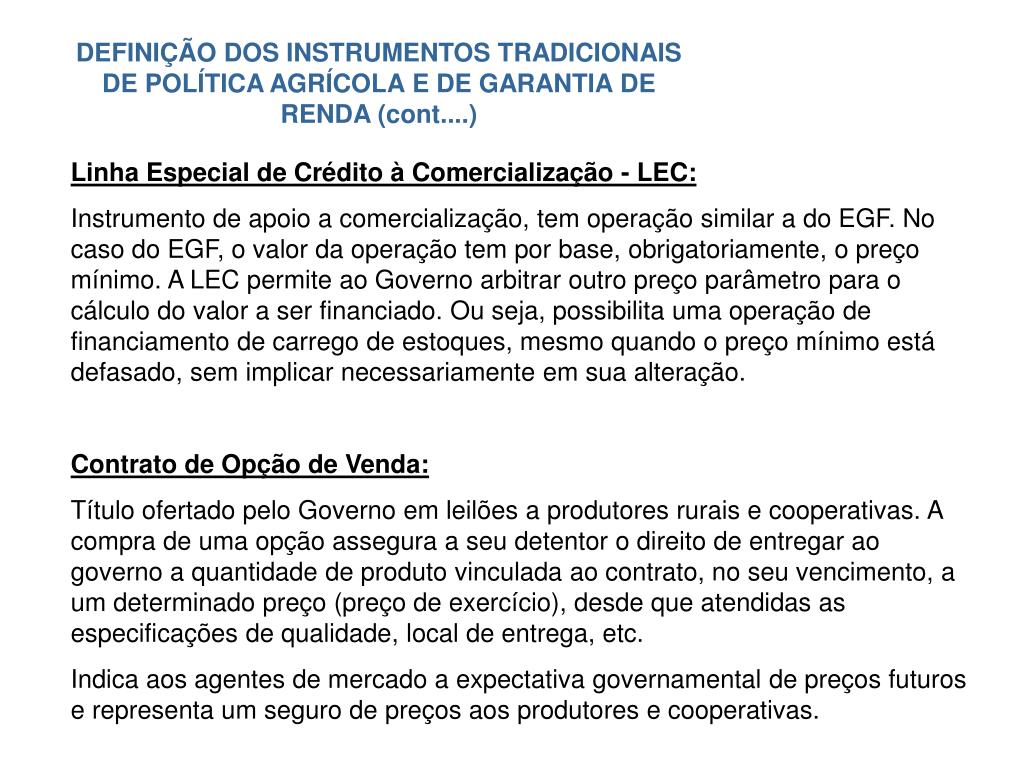 DEFINIÇÃO DOS INSTRUMENTOS TRADICIONAIS DE POLÍTICA AGRÍCOLA E DE GARANTIA DE RENDA (cont....) Linha Especial de Crédito à Comercialização - LEC: Instrumento de apoio a comercialização, tem operação similar a do EGF. No caso do EGF, o valor da operação tem por base, obrigatoriamente, o preço mínimo. A LEC permite ao Governo arbitrar outro preço parâmetro para o cálculo do valor a ser financiado. Ou seja, possibilita uma operação de financiamento de carrego de estoques, mesmo quando o preço mínimo está defasado, sem implicar necessariamente em sua alteração. Contrato de Opção de Venda: Título ofertado pelo Governo em leilões a produtores rurais e cooperativas. A compra de uma opção assegura a seu detentor o direito de entregar ao governo a quantidade de produto vinculada ao contrato, no seu vencimento, a um determinado preço (preço de exercício), desde que atendidas as especificações de qualidade, local de entrega, etc. Indica aos agentes de mercado a expectativa governamental de preços futuros e representa um seguro de preços aos produtores e cooperativas.