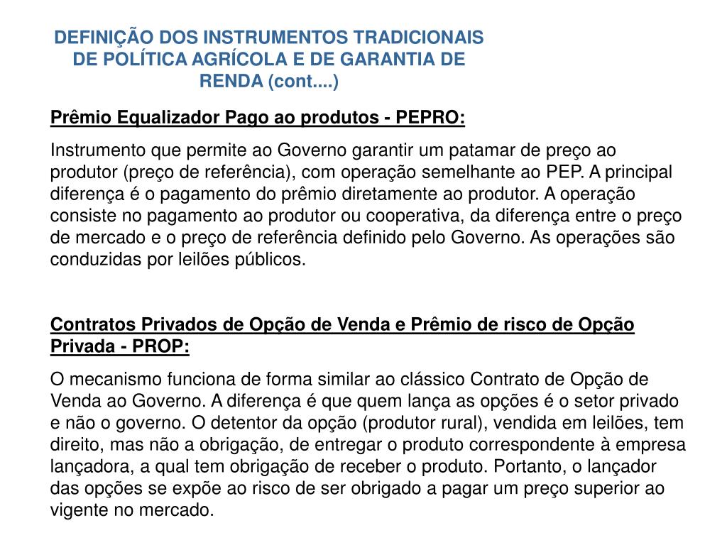 DEFINIÇÃO DOS INSTRUMENTOS TRADICIONAIS DE POLÍTICA AGRÍCOLA E DE GARANTIA DE RENDA (cont....) Prêmio Equalizador Pago ao produtos - PEPRO: Instrumento que permite ao Governo garantir um patamar de preço ao produtor (preço de referência), com operação semelhante ao PEP. A principal diferença é o pagamento do prêmio diretamente ao produtor. A operação consiste no pagamento ao produtor ou cooperativa, da diferença entre o preço de mercado e o preço de referência definido pelo Governo. As operações são conduzidas por leilões públicos. Contratos Privados de Opção de Venda e Prêmio de risco de Opção Privada - PROP: O mecanismo funciona de forma similar ao clássico Contrato de Opção de Venda ao Governo. A diferença é que quem lança as opções é o setor privado e não o governo. O detentor da opção (produtor rural), vendida em leilões, tem direito, mas não a obrigação, de entregar o produto correspondente à empresa lançadora, a qual tem obrigação de receber o produto. Portanto, o lançador das opções se expõe ao risco de ser obrigado a pagar um preço superior ao vigente no mercado.