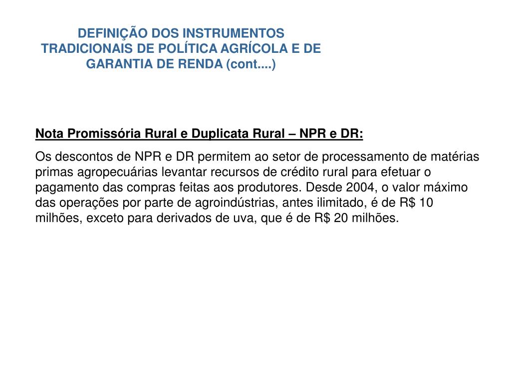 DEFINIÇÃO DOS INSTRUMENTOS TRADICIONAIS DE POLÍTICA AGRÍCOLA E DE GARANTIA DE RENDA (cont....) Nota Promissória Rural e Duplicata Rural – NPR e DR: Os descontos de NPR e DR permitem ao setor de processamento de matérias primas agropecuárias levantar recursos de crédito rural para efetuar o pagamento das compras feitas aos produtores. Desde 2004, o valor máximo das operações por parte de agroindústrias, antes ilimitado, é de R$ 10 milhões, exceto para derivados de uva, que é de R$ 20 milhões.