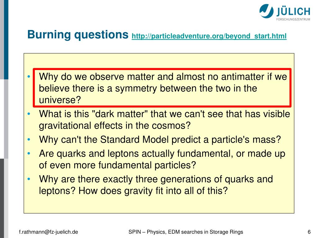 Burningquestionshttp://particleadventure.org/beyond_start.htmlBurningquestionshttp://particleadventure.org/beyond_start.html • Why do we observe matter and almost no antimatter if we believe there is a symmetry between the two in the universe? • What is this "dark matter" that we can't see that has visible gravitational effects in the cosmos? • Why can't the Standard Model predict a particle's mass? • Are quarks and leptons actually fundamental, or made up of even more fundamental particles? • Why are there exactly three generations of quarks and leptons? How does gravity fit into all of this? SPIN – Physics, EDM searches in Storage Rings