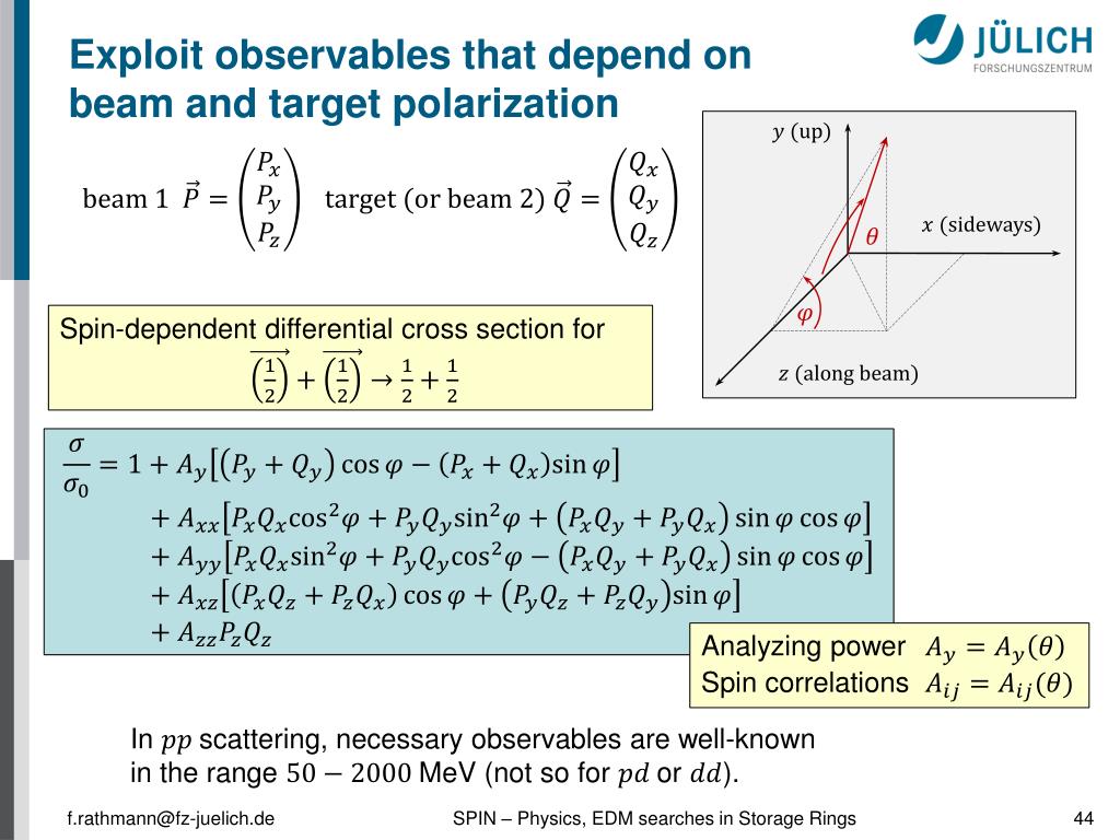 Exploit observables thatdepend onbeam andtargetpolarization Spin-dependent differential crosssectionfor Analyzing power Spin correlations In scattering, necessary observables are well-knownin therangeMeV (not so foror). SPIN – Physics, EDM searches in Storage Rings