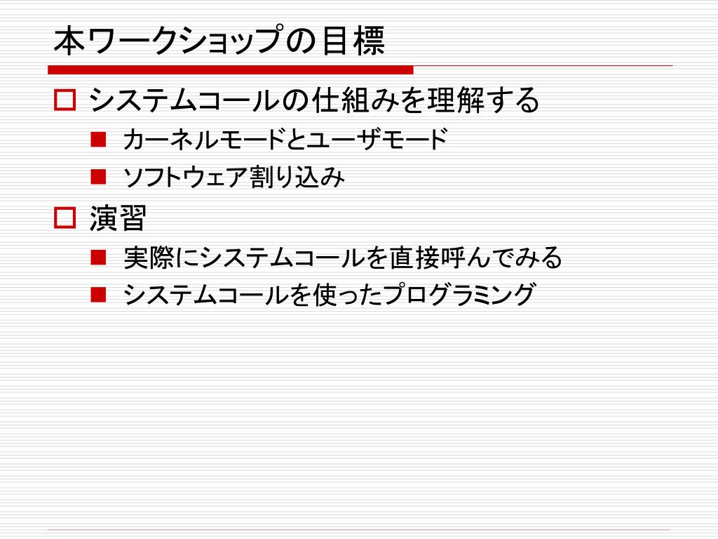 本ワークショップの目標 • システムコールの仕組みを理解する • カーネルモードとユーザモード • ソフトウェア割り込み • 演習 • 実際にシステムコールを直接呼んでみる • システムコールを使ったプログラミング