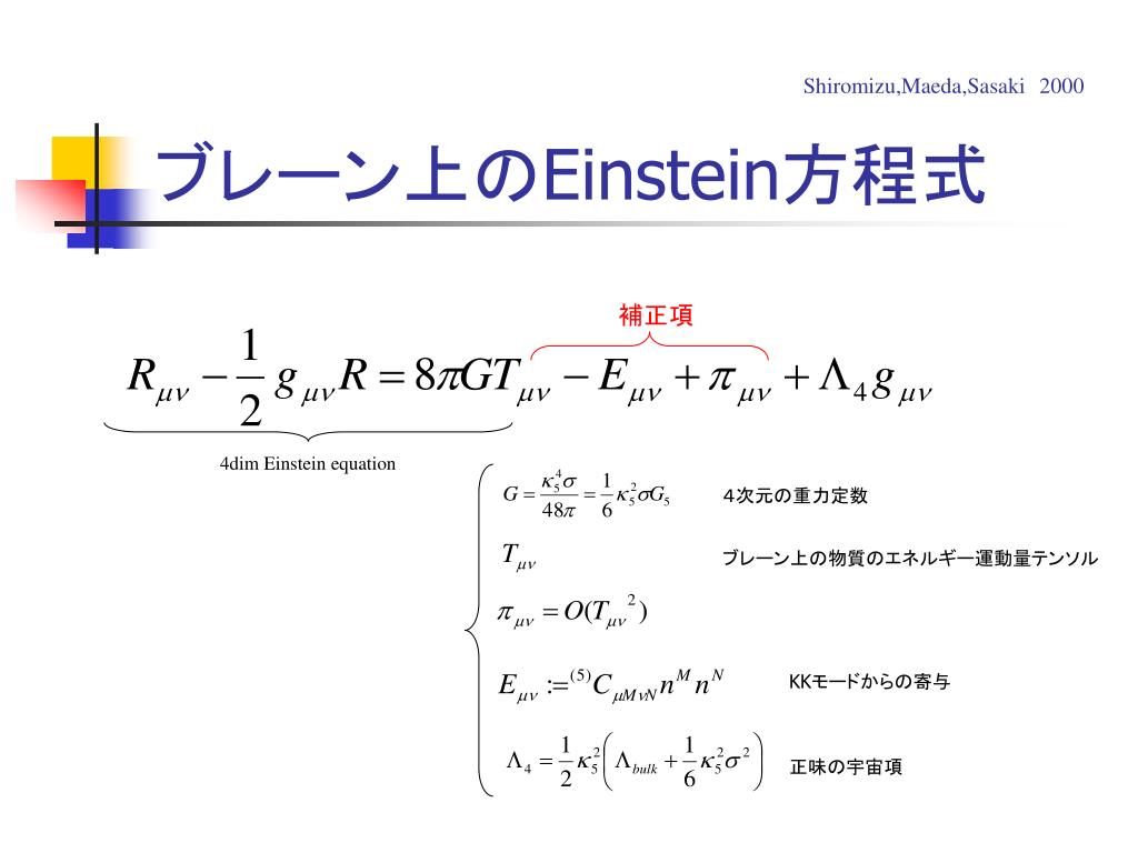 Shiromizu,Maeda,Sasaki2000 ブレーン上のEinstein方程式 補正項 4dim Einstein equation 4次元の重力定数 ブレーン上の物質のエネルギー運動量テンソル KKモードからの寄与 正味の宇宙項