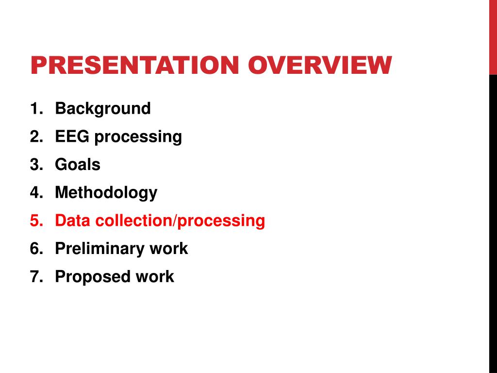 Presentation overview • Background • EEG processing • Goals • Methodology • Data collection/processing • Preliminary work • Proposed work