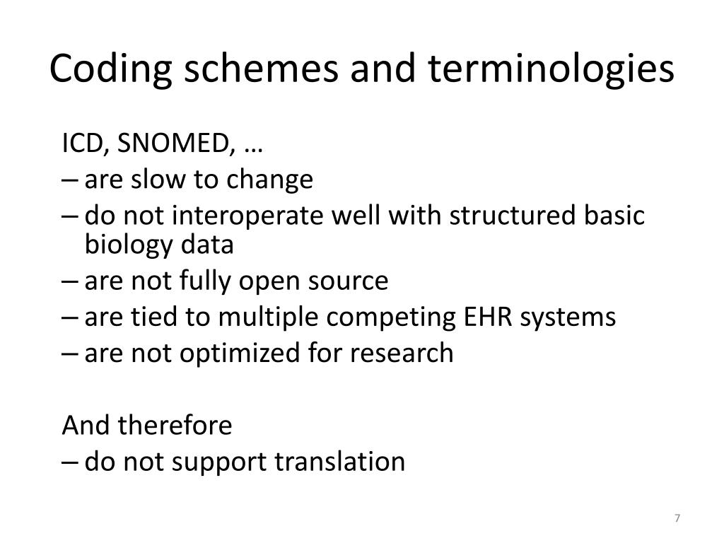 Coding schemes and terminologies ICD, SNOMED, … • are slow to change • do not interoperate well with structured basic biology data • are not fully open source • are tied to multiple competing EHR systems • are not optimized for research And therefore • do not support translation