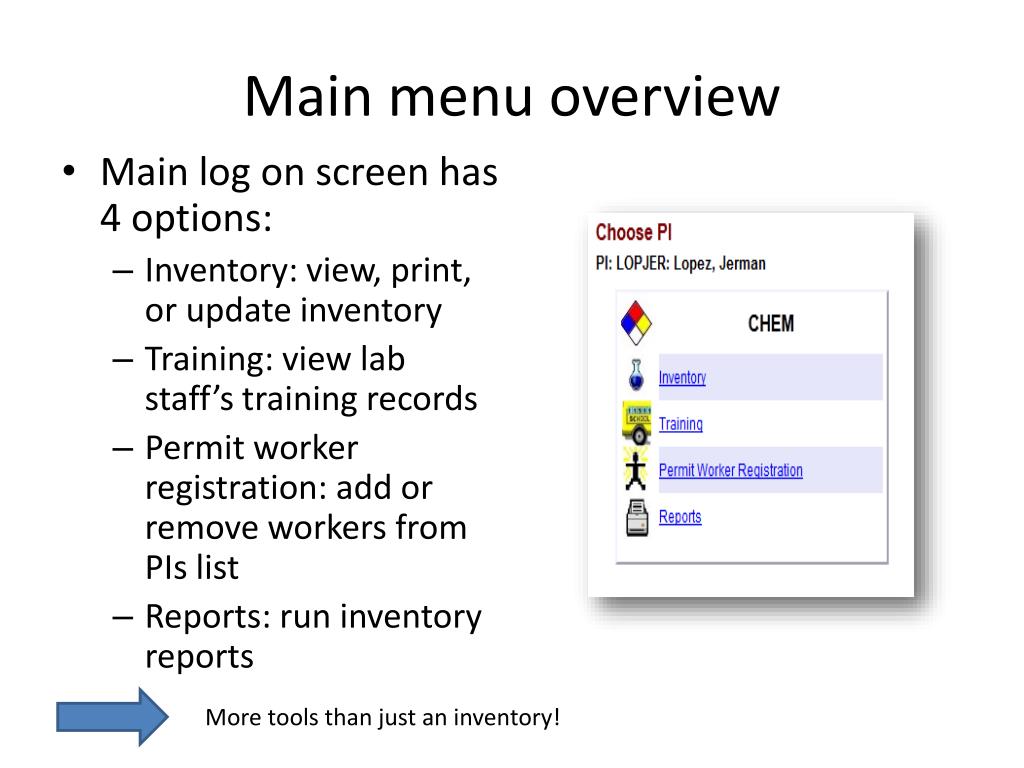 Main menu overview • Main log on screen has 4 options: • Inventory: view, print, or update inventory • Training: view lab staff’s training records • Permit worker registration: add or remove workers from PIs list • Reports: run inventory reports More tools than just an inventory!