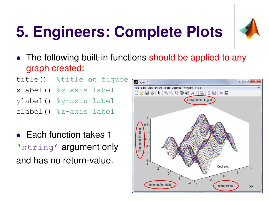5. Engineers: Complete Plots • The following built-in functions should be applied to any graph created: title() %title on figure xlabel() %x-axis label ylabel() %y-axis label zlabel() %z-axis label • Each function takes 1 ‘string’ argument only and has no return-value. 22
