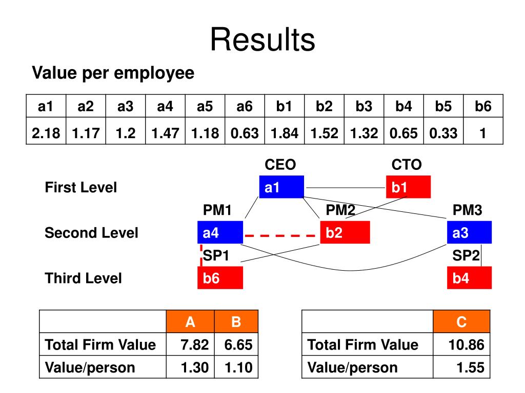 B1 A1 A5 B5 B2 B6 B3 B4 A6 A2 A4 A3 Approach Firm A Firm B Firm C ? + = • Assumptions • Same market, slightly different competencies • Firm C will be made up of 6 < C < 12 • At least one employee at each level • Three levels available