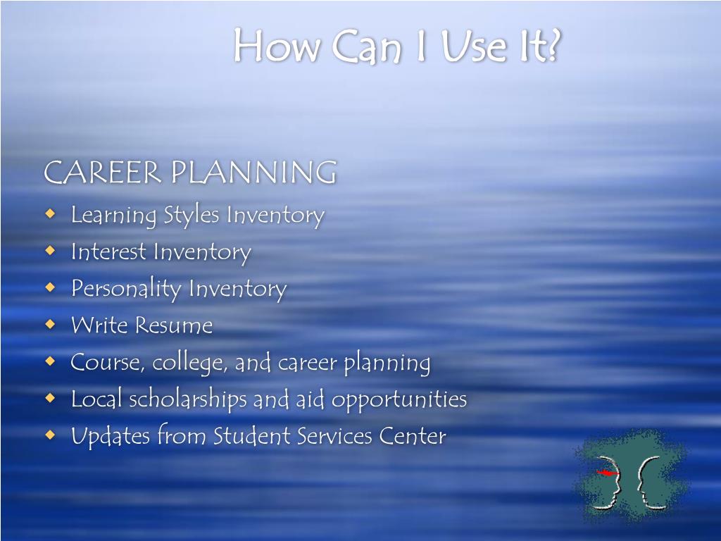 How Can I Use It? CAREER PLANNING • Learning Styles Inventory • Interest Inventory • Personality Inventory • Write Resume • Course, college, and career planning • Local scholarships and aid opportunities • Updates from Student Services Center