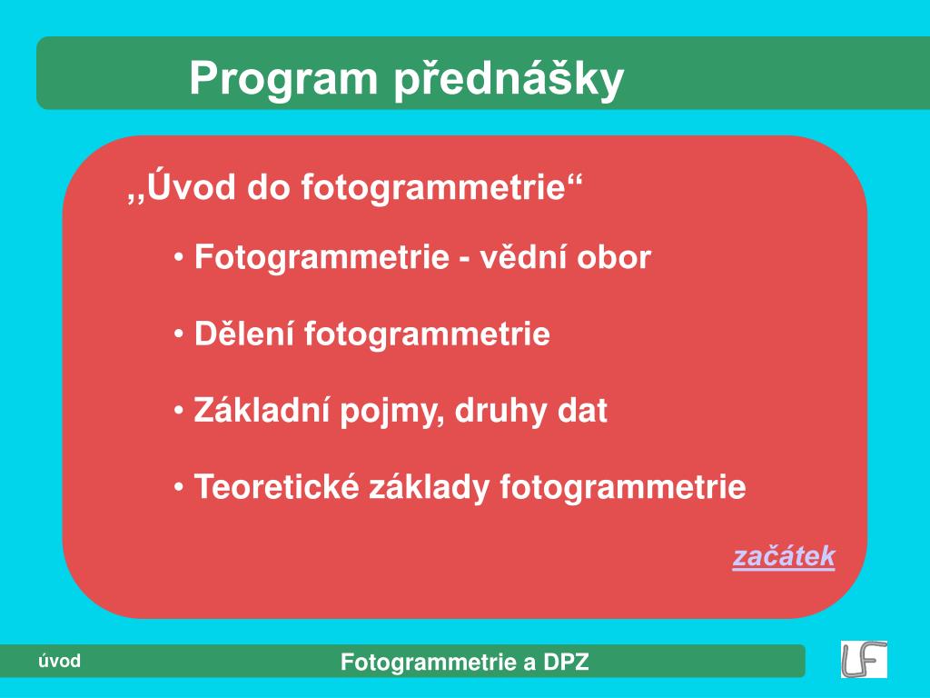 Program přednášky ,,Úvod do fotogrammetrie“ • Fotogrammetrie - vědní obor • Dělení fotogrammetrie • Základní pojmy, druhy dat • Teoretické základy fotogrammetrie • začátek Fotogrammetrie a DPZ úvod