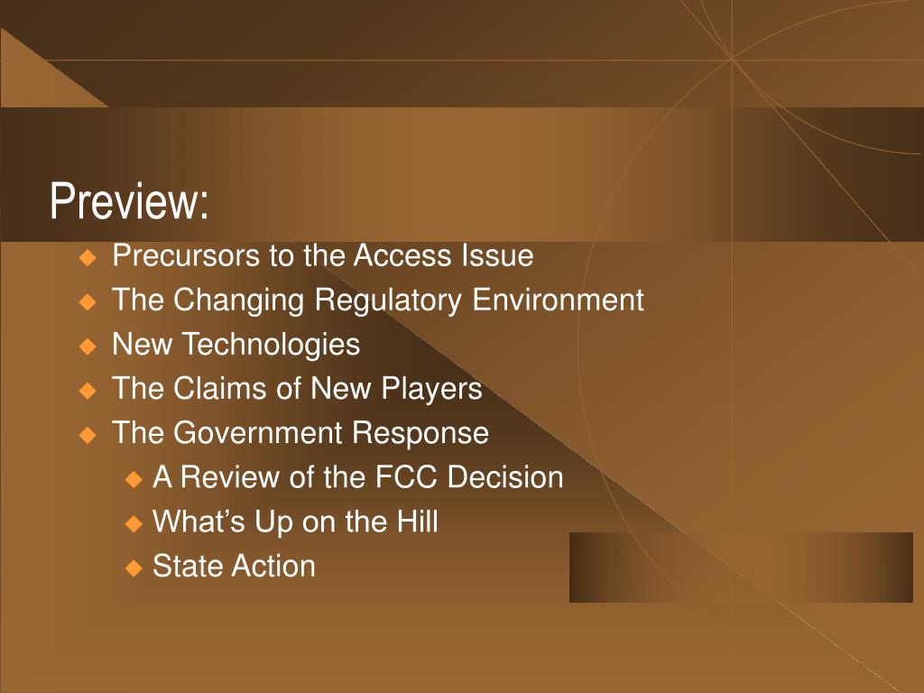 Preview: • Precursors to the Access Issue • The Changing Regulatory Environment • New Technologies • The Claims of New Players • The Government Response • A Review of the FCC Decision • What’s Up on the Hill • State Action