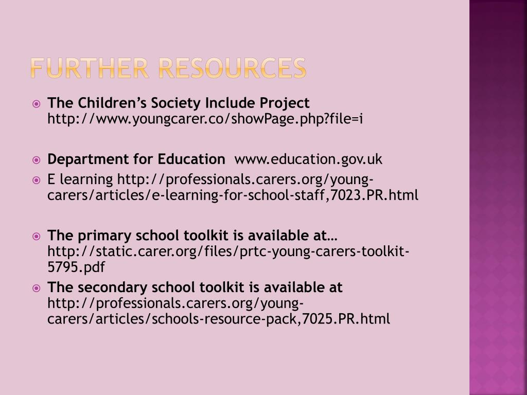 Further Resources • The Children’s Society Include Project http://www.youngcarer.co/showPage.php?file=i • Department for Education www.education.gov.uk • E learning http://professionals.carers.org/young-carers/articles/e-learning-for-school-staff,7023.PR.html • The primary school toolkit is available at… http://static.carer.org/files/prtc-young-carers-toolkit-5795.pdf • The secondary school toolkit is available at http://professionals.carers.org/young-carers/articles/schools-resource-pack,7025.PR.html