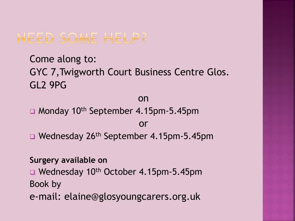 Need some help? Come along to: GYC 7,Twigworth Court Business Centre Glos. GL2 9PG on • Monday 10th September 4.15pm-5.45pm or • Wednesday 26th September 4.15pm-5.45pm Surgery available on • Wednesday 10th October 4.15pm-5.45pm Book by e-mail: elaine@glosyoungcarers.org.uk