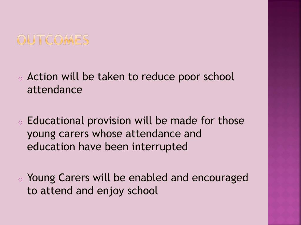 Outcomes • Action will be taken to reduce poor school attendance • Educational provision will be made for those young carers whose attendance and education have been interrupted • Young Carers will be enabled and encouraged to attend and enjoy school
