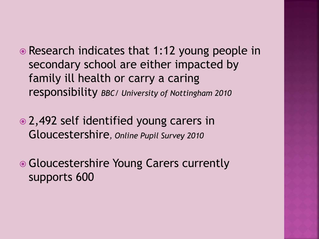 Research indicates that 1:12 young people in secondary school are either impacted by family ill health or carry a caring responsibility BBC/ University of Nottingham 2010 • 2,492 self identified young carers in Gloucestershire, Online Pupil Survey 2010 • Gloucestershire Young Carers currently supports 600