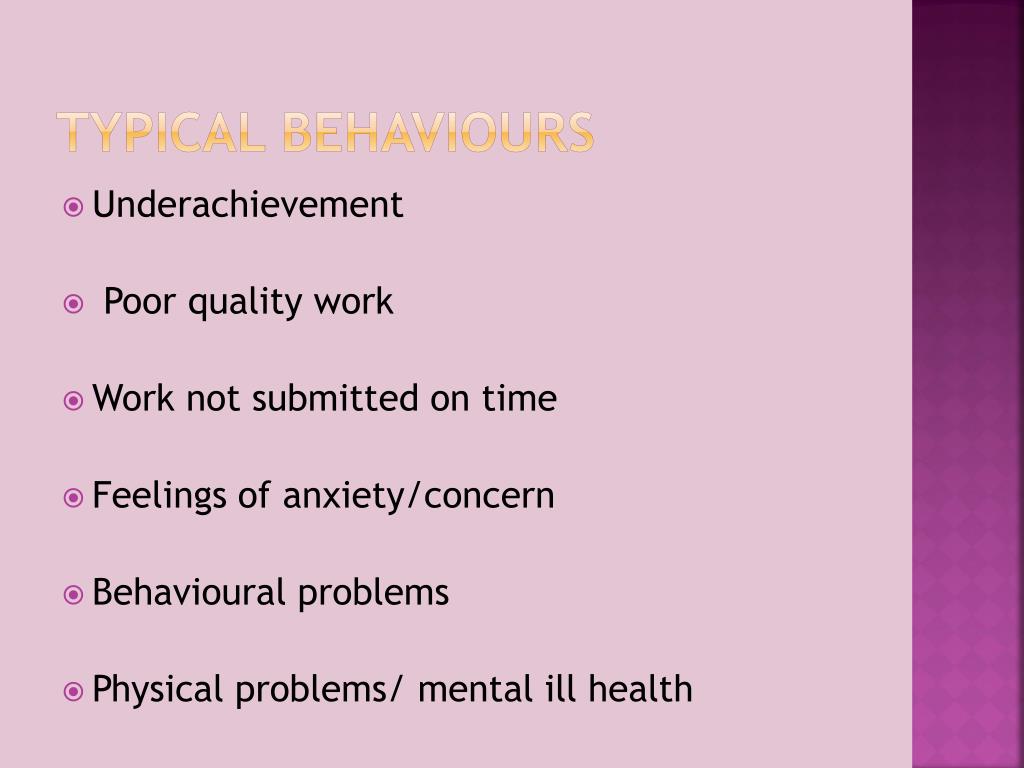Typical behaviours • Underachievement • Poor quality work • Work not submitted on time • Feelings of anxiety/concern • Behavioural problems • Physical problems/ mental ill health