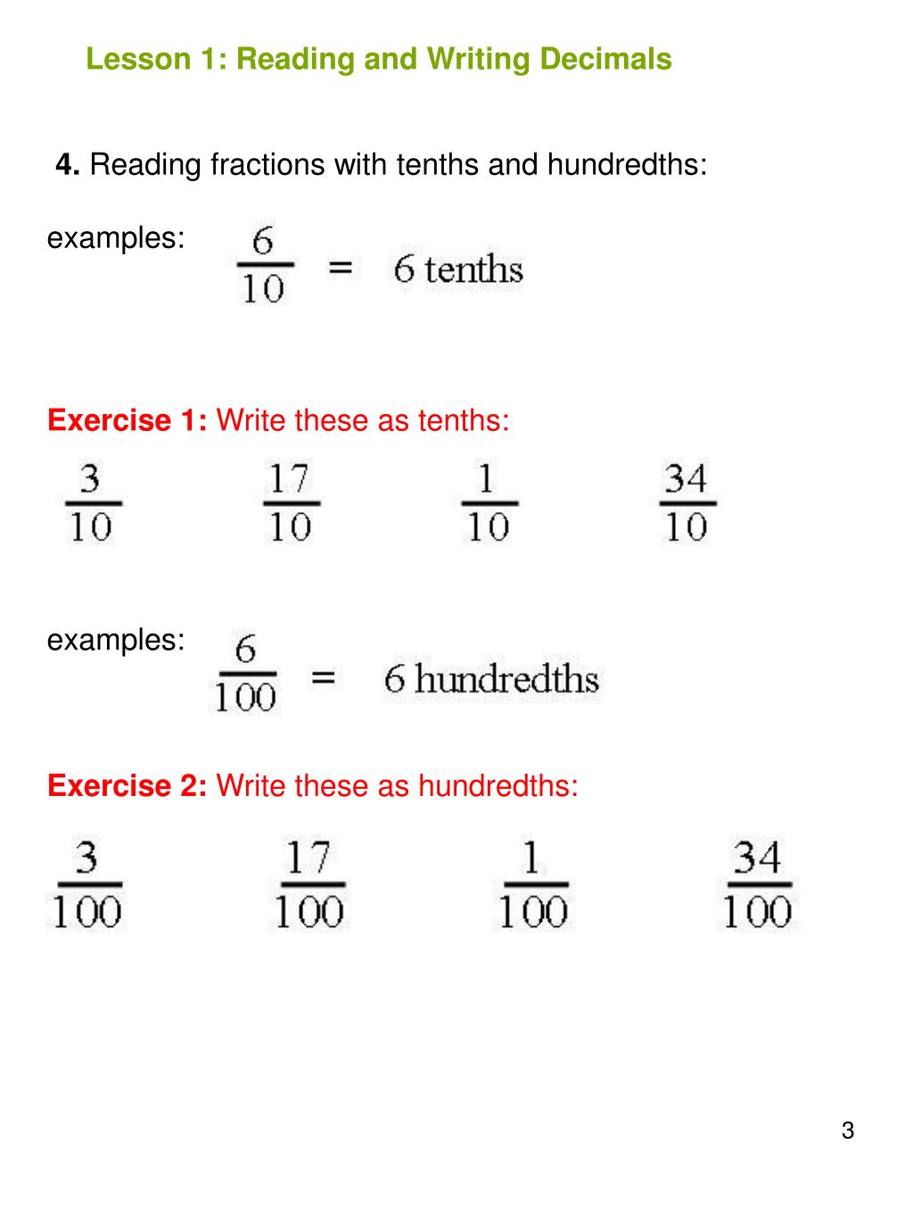 Lesson 1: Reading and Writing Decimals 4. Reading fractions with tenths and hundredths: examples: Exercise 1: Write these as tenths: examples: Exercise 2: Write these as hundredths: