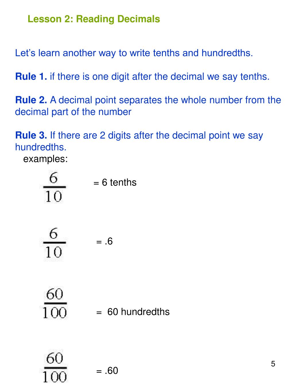 Lesson 2: Reading Decimals Let’s learn another way to write tenths and hundredths. Rule 1. if there is one digit after the decimal we say tenths. Rule 2. A decimal point separates the whole number from the decimal part of the number Rule 3. If there are 2 digits after the decimal point we say hundredths. examples: = 6 tenths = .6 = 60 hundredths = .60