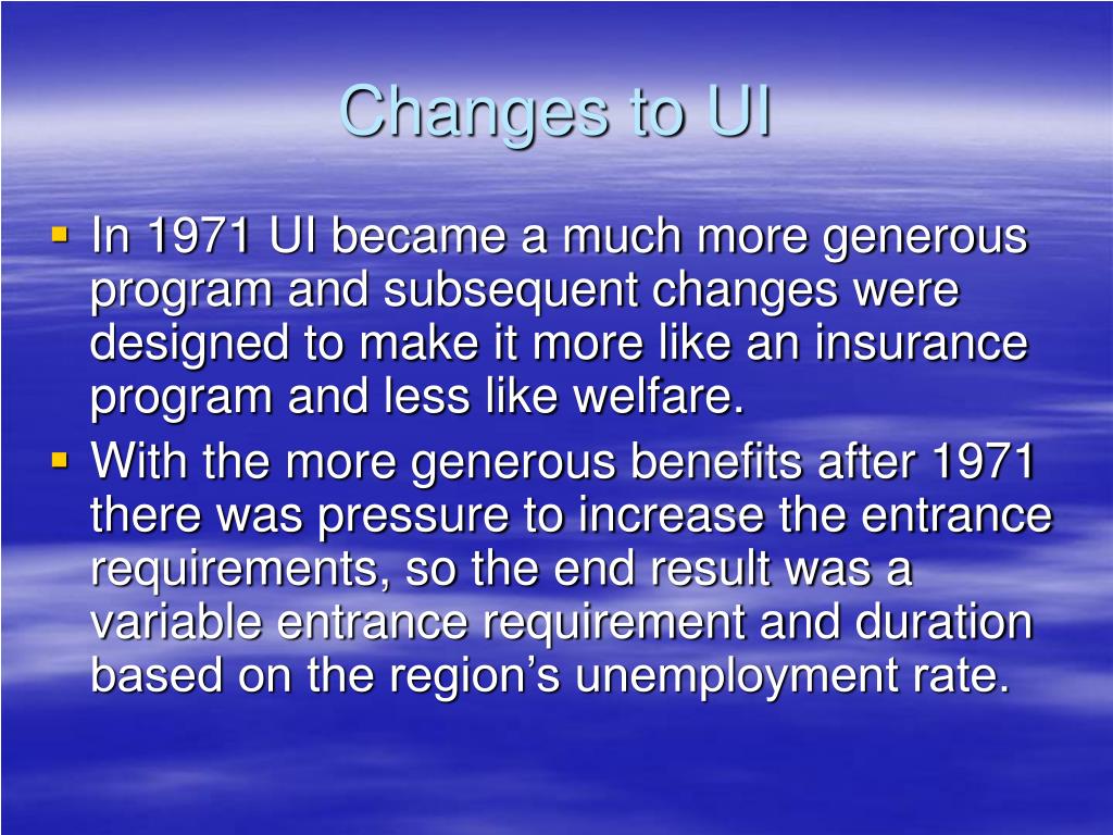 Changes to UI • In 1971 UI became a much more generous program and subsequent changes were designed to make it more like an insurance program and less like welfare. • With the more generous benefits after 1971 there was pressure to increase the entrance requirements, so the end result was a variable entrance requirement and duration based on the region’s unemployment rate.