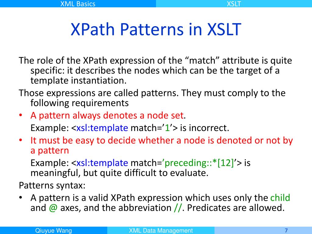 XPath Patterns in XSLT The role of the XPath expression of the “match” attribute is quite specific: it describes the nodes which can be the target of a template instantiation. Those expressions are called patterns. They must comply to the following requirements • A pattern always denotes a node set. Example: <xsl:template match=’1’> is incorrect. • It must be easy to decide whether a node is denoted or not by a pattern Example: <xsl:template match=’preceding::*[12]’> is meaningful, but quite difficult to evaluate. Patterns syntax: • A pattern is a valid XPath expression which uses only the child and @ axes, and the abbreviation //. Predicates are allowed.