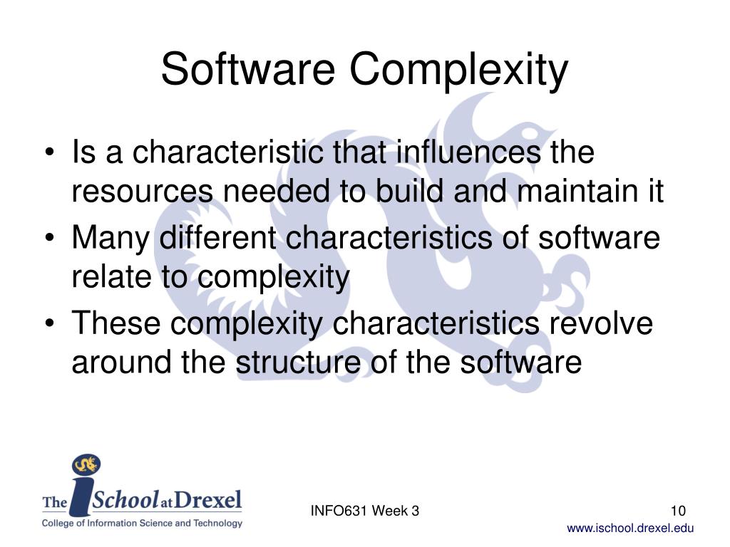 Software Complexity • Is a characteristic that influences the resources needed to build and maintain it • Many different characteristics of software relate to complexity • These complexity characteristics revolve around the structure of the software INFO631 Week 3
