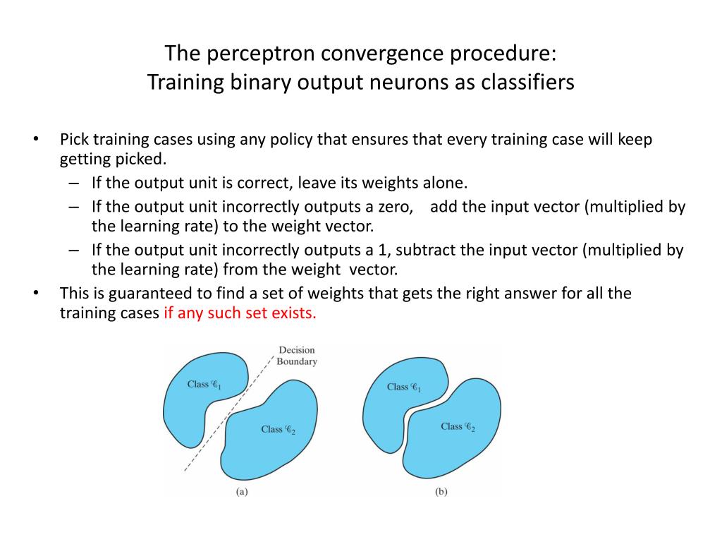 The perceptron convergence procedure: Training binary output neurons as classifiers • Pick training cases using any policy that ensures that every training case will keep getting picked. • If the output unit is correct, leave its weights alone. • If the output unit incorrectly outputs a zero, add the input vector (multiplied by the learning rate) to the weight vector. • If the output unit incorrectly outputs a 1, subtract the input vector (multiplied by the learning rate) from the weight vector. • This is guaranteed to find a set of weights that gets the right answer for all the training cases if any such set exists.