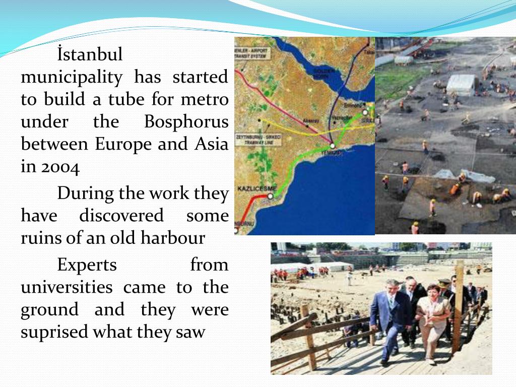 İstanbul municipality has startedtobuild a tubefor metro undertheBosphorusbetweenEuropeandAsia in 2004 Duringtheworktheyhavediscoveredsomeruins of an oldharbour Expertsfromuniversitiescametothegroundandtheyweresuprisedwhattheysaw