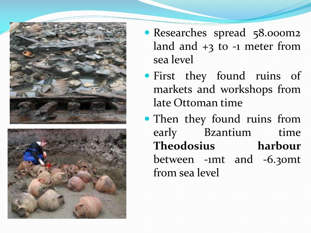 Researches spread 58.000m2 landand +3 to-1 meterfromsealevel • Firsttheyfoundruins of marketsandworkshopsfromlateOttoman time • ThentheyfoundruinsfromearlyBzantium time Theodosiusharbourbetween -1mt and -6.30mt fromsealevel