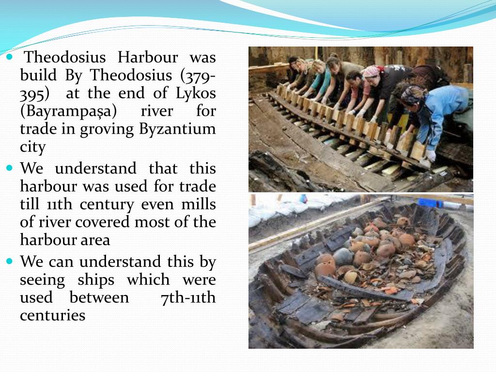TheodosiusHarbourwasbuildByTheodosius(379-395) at theend of Lykos(Bayrampaşa) riverfortrade in grovingByzantiumcity • Weunderstandthatthisharbourwasusedfortradetill 11th centuryevenmills of rivercoveredmost of theharbourarea • We can understandthisbyseeingshipswhichwereusedbetween 7th-11th centuries