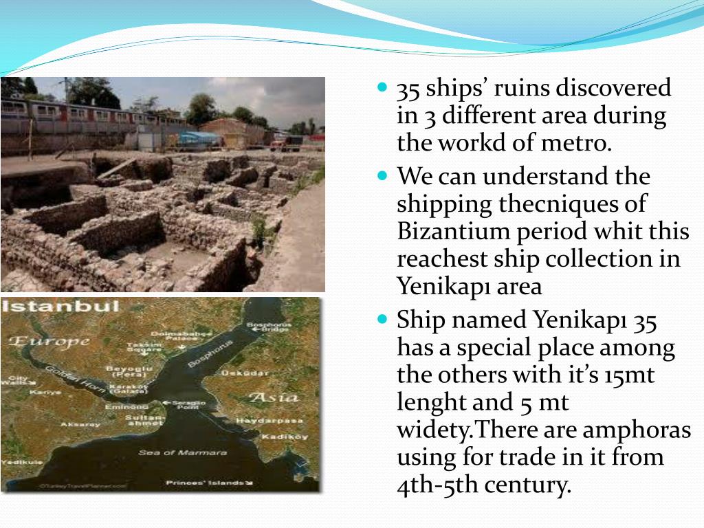 35 ships’ ruinsdiscovered in 3 differentareaduringtheworkd of metro. • We can understandtheshippingthecniques of Bizantiumperiodwhitthisreachestshipcollection in Yenikapı area • Shipnamed Yenikapı 35 has a specialplaceamongtheotherswithit’s 15mt lenghtand 5 mtwidety.Thereareamphorasusingfortrade in it from 4th-5th century.