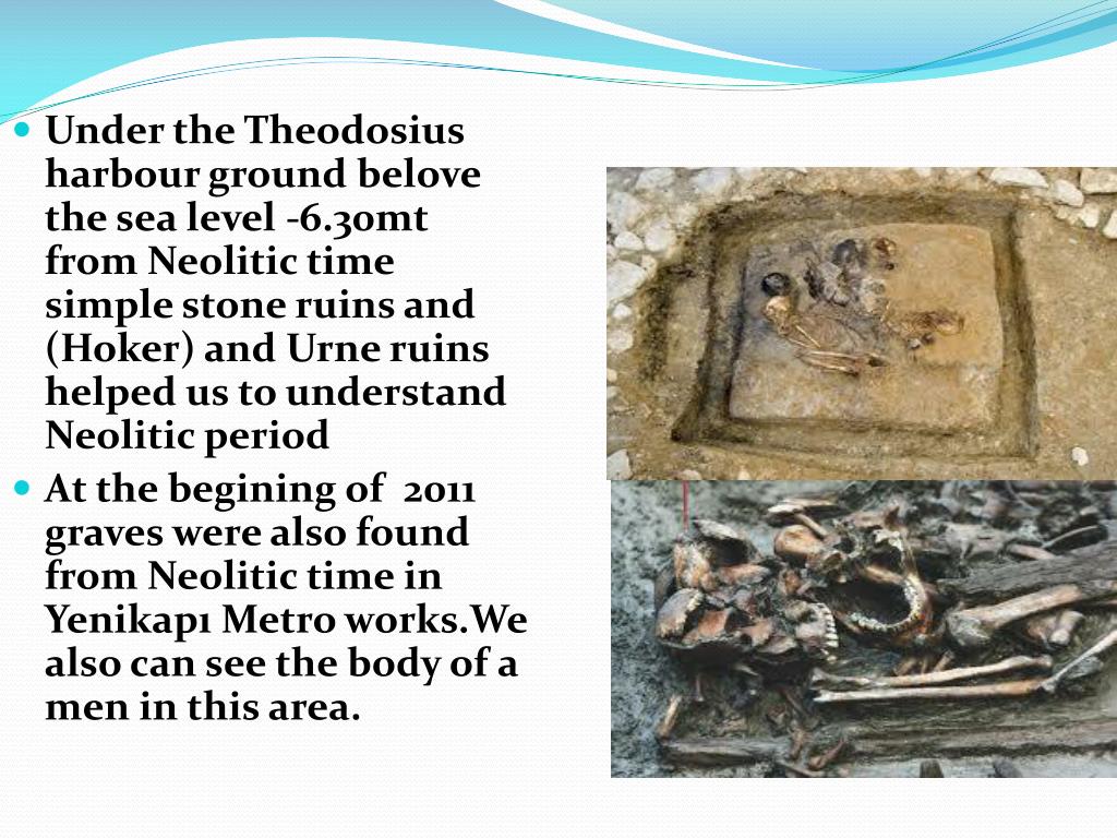 UndertheTheodosiusharbourgroundbelovethesealevel -6.30mt fromNeolitic time simplestoneruinsand (Hoker) andUrneruinshelped us tounderstandNeoliticperiod • At thebegining of 2011 graveswerealsofoundfromNeolitic time in Yenikapı Metro works.Wealso can seethe body of a men in thisarea.