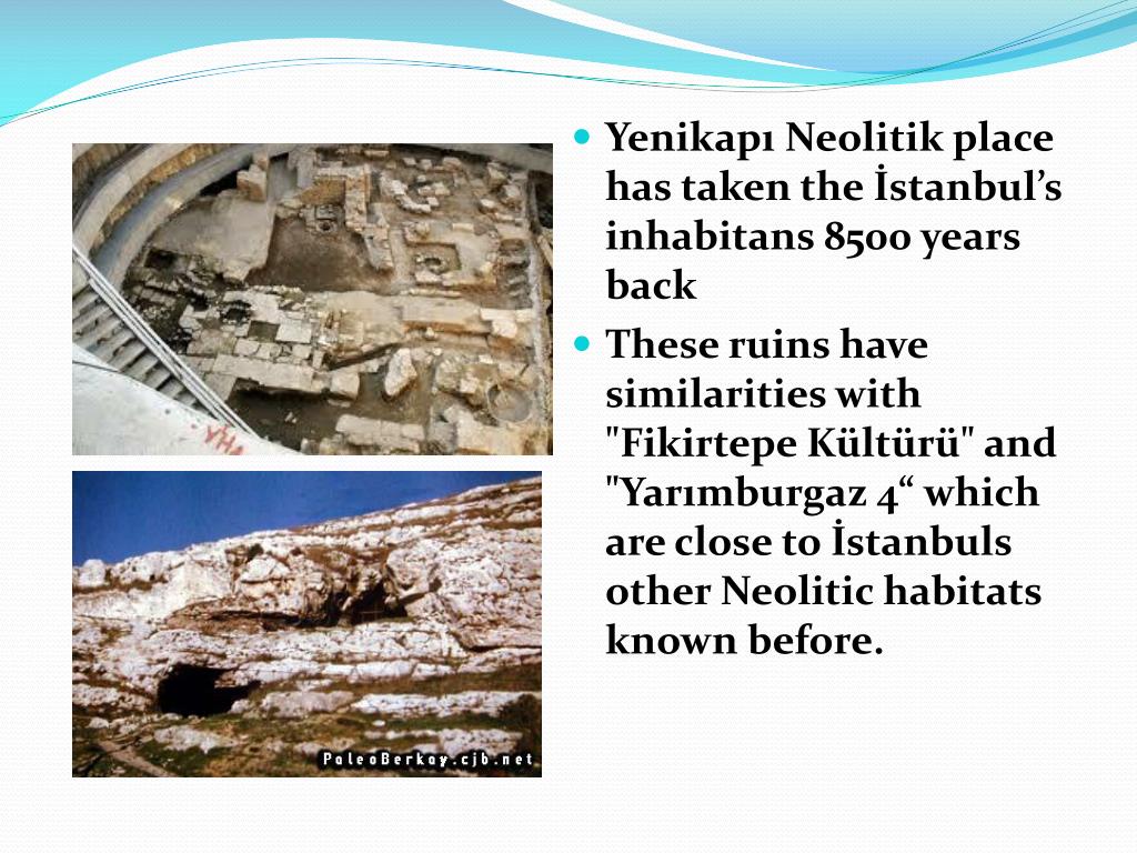Yenikapı Neolitik place has takentheİstanbul’sinhabitans 8500 yearsback • Theseruinshavesimilaritieswith "Fikirtepe Kültürü" and"Yarımburgaz4“ whichareclosetoİstanbulsotherNeolitichabitatsknownbefore.