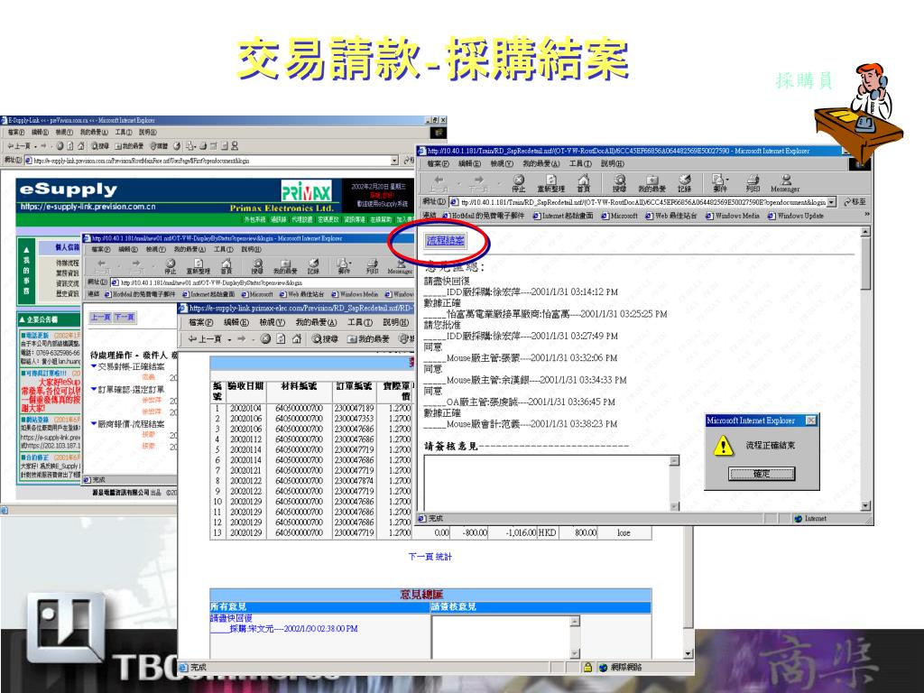 訂單簽核效益說明 中心廠商 供應商 無紙化簽核程序,電腦化追蹤 跟催,縮短訂單處理週期 (5天==>2.3天) 訂單依採購人員分類處理控管, 確保訂單完整性與正確性 落實採購額度審批權限管理, 加強內部控制大幅降低風險 節省電話/傳真費用 即時溝通與反應,提昇雙方 訂單作業處理速度及效率 節省大量人工作業,避免人為 疏失及錯誤 將作業模式由“人等待事”變為 “人安排事”,大幅提昇作業效率 節省電話/傳真費用 Next