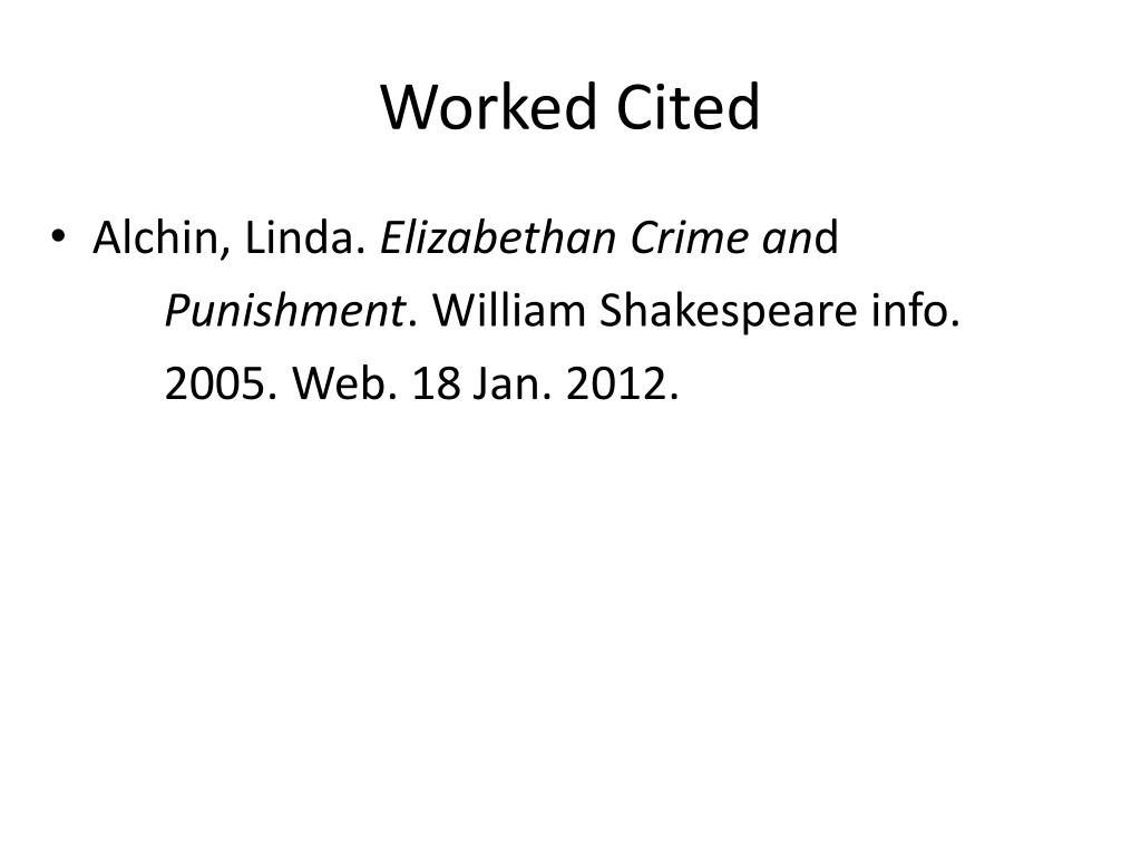 Worked Cited • Alchin, Linda. Elizabethan Crime and Punishment. William Shakespeare info. 2005. Web. 18 Jan. 2012.