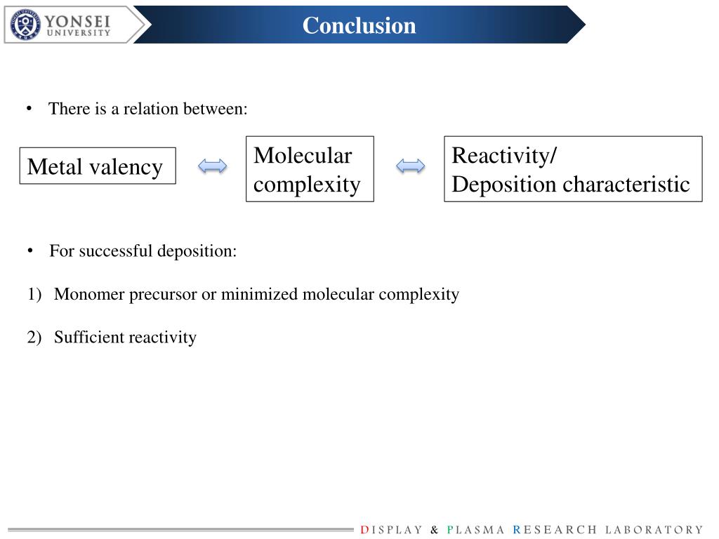 Conclusion • There is a relation between: Molecular complexity Reactivity/ Deposition characteristic Metal valency • For successful deposition: • Monomer precursor or minimized molecular complexity • Sufficient reactivity