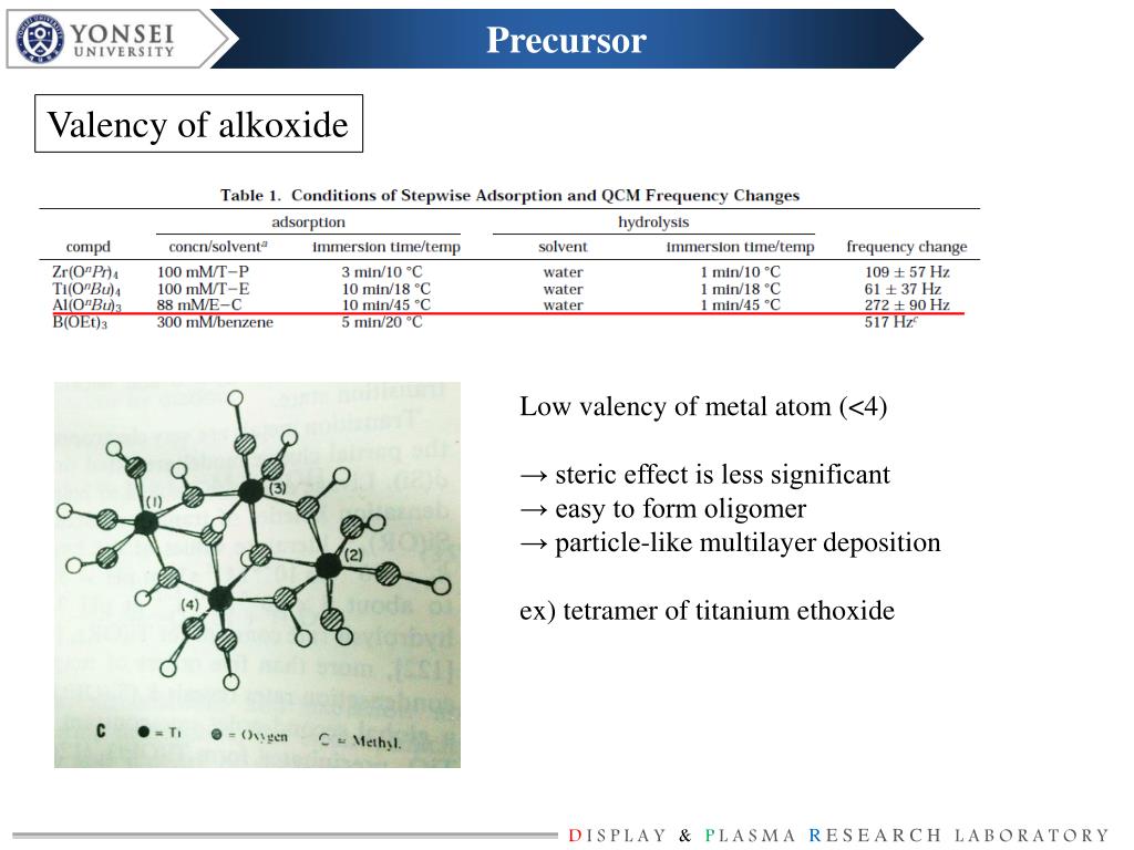 Precursor Valency of alkoxide Low valency of metal atom (<4) → steric effect is less significant → easy to form oligomer → particle-like multilayer deposition ex) tetramer of titanium ethoxide