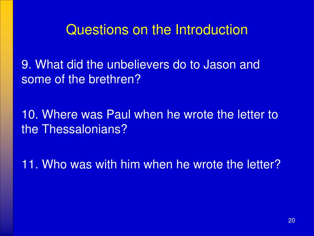 Questions on the Introduction 9. What did the unbelievers do to Jason and some of the brethren? 10. Where was Paul when he wrote the letter to the Thessalonians? 11. Who was with him when he wrote the letter?