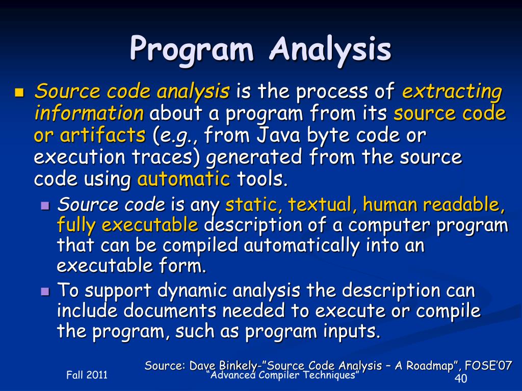 Program Analysis • Source code analysisis the process of extracting information about a program from its source code or artifacts (e.g., from Java byte code or execution traces) generated from the source code using automatic tools. • Source code is any static, textual, human readable, fully executable description of a computer program that can be compiled automatically into an executable form. • To support dynamic analysis the description can include documents needed to execute or compile the program, such as program inputs. Source: Dave Binkely-”Source Code Analysis – A Roadmap”, FOSE’07 “Advanced Compiler Techniques”