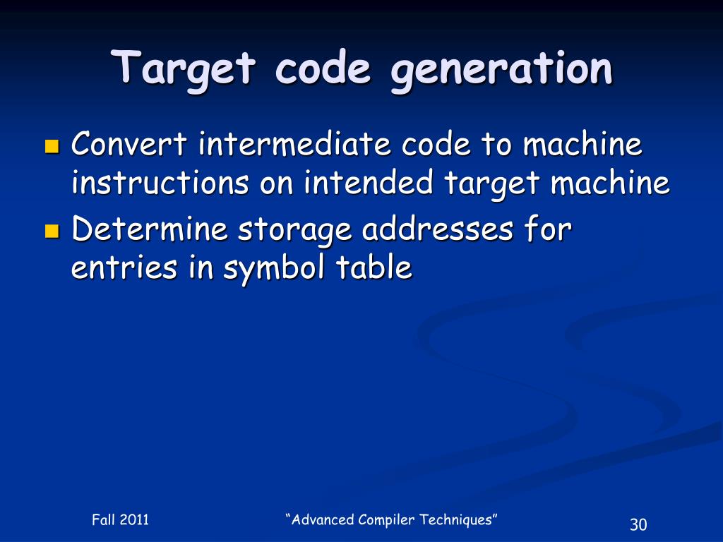 Target code generation • Convert intermediate code to machine instructions on intended target machine • Determine storage addresses for entries in symbol table “Advanced Compiler Techniques”