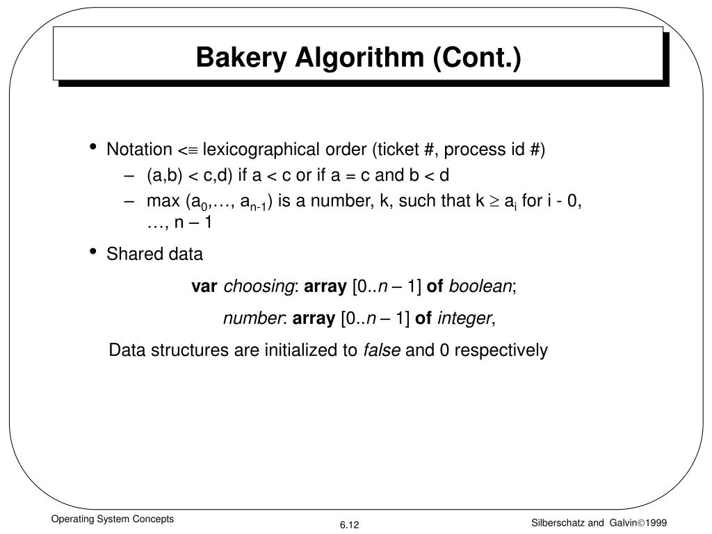 Bakery Algorithm (Cont.) • Notation < lexicographical order (ticket #, process id #) • (a,b) < c,d) if a < c or if a = c and b < d • max (a0,…, an-1) is a number, k, such that k ai for i - 0, …, n – 1 • Shared data varchoosing: array [0..n– 1] ofboolean; number: array [0..n – 1] ofinteger, Data structures are initialized to false and 0 respectively Operating System Concepts