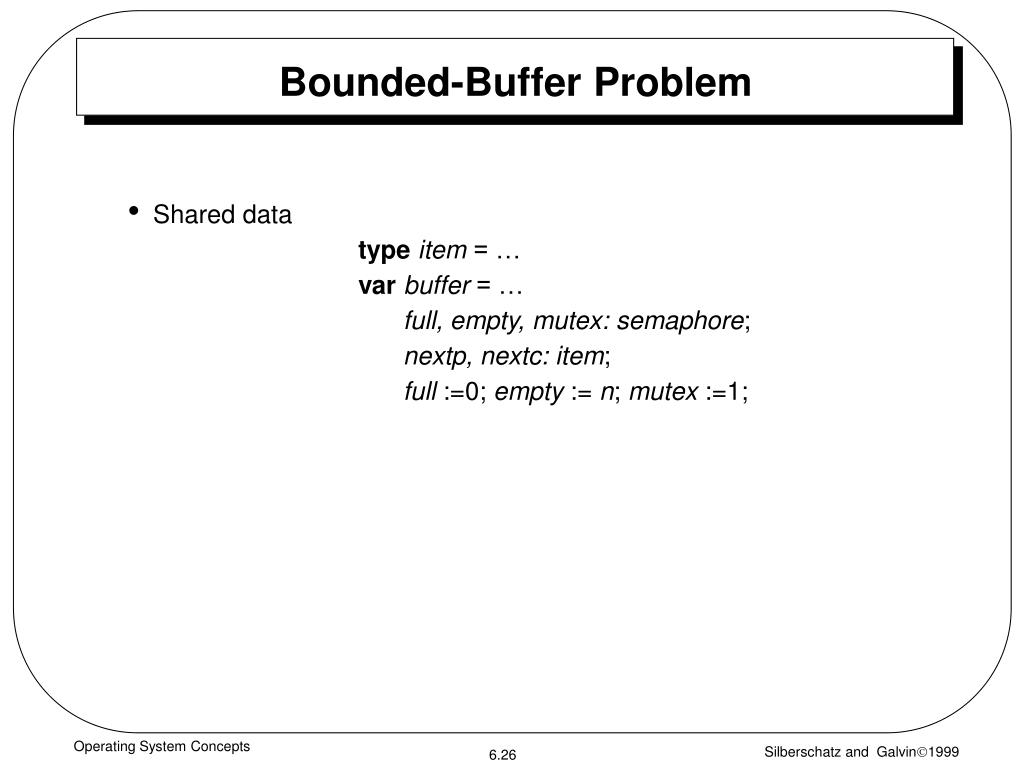 Bounded-Buffer Problem • Shared data typeitem = … varbuffer = … full, empty, mutex: semaphore; nextp, nextc: item; full :=0; empty := n; mutex :=1; Operating System Concepts